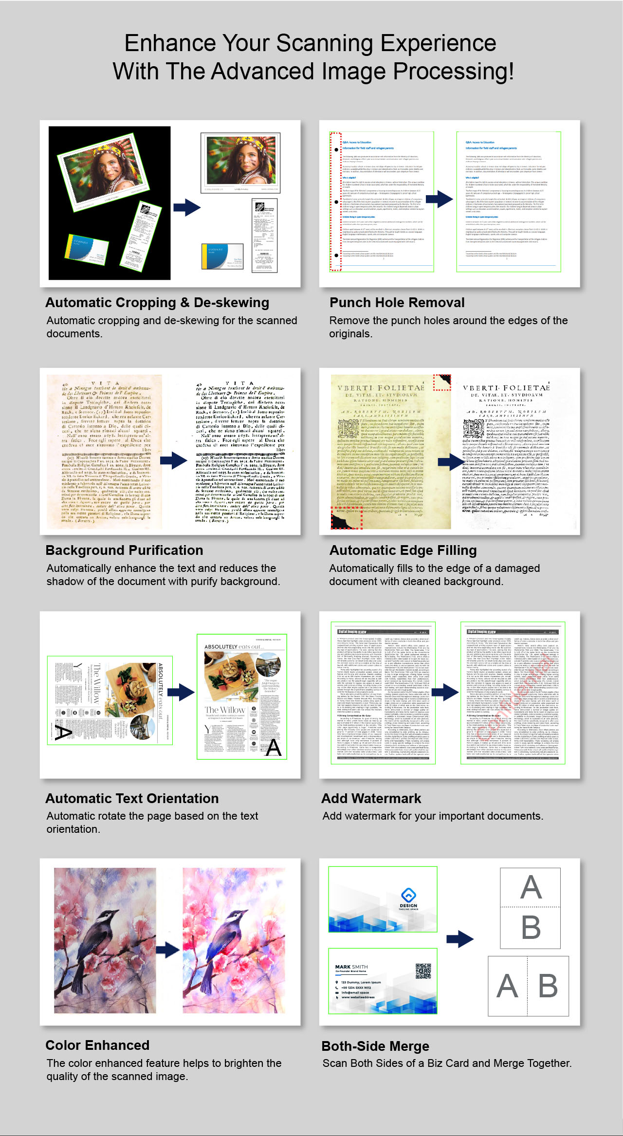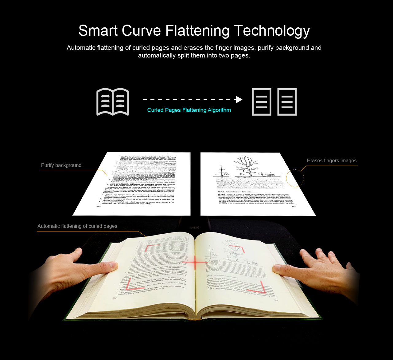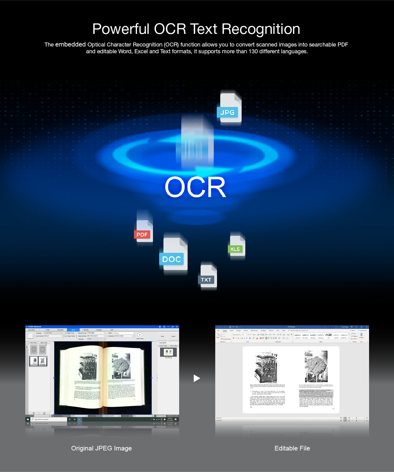 With the embedded OCR feature you can convert all the scanned files into PDF or editable Word/Excel/ePub/Txt files. Along with these great features, you can use the bundled VIISAN scanning software with this smart device to get great results while scanning books. For example, it can automatically digitally flattens curved pages, erases fingers from the scanned photos, repairs the damaged edges of documents, rotates pages based on text orientation, and automatically splits double-page into separate images.