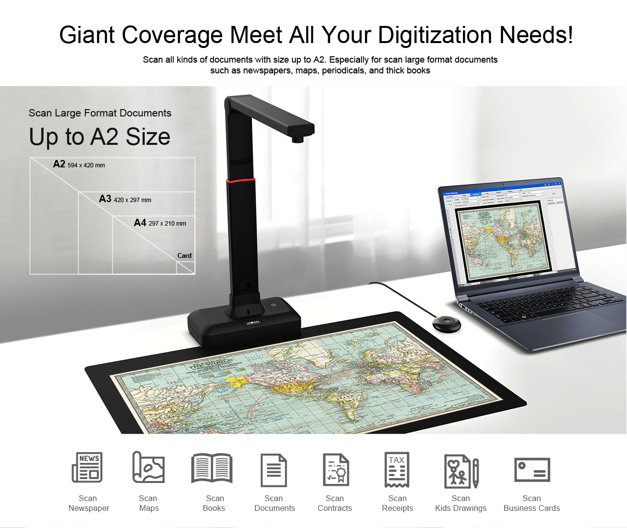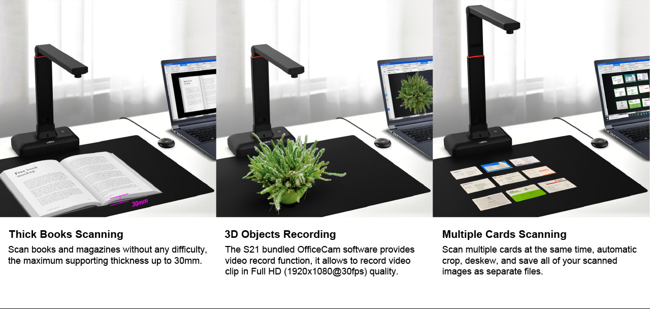 The S21 is a perfect A2 large format overhead document camera, ideal for scanning large format journals, manuscripts, newspapers, and maps. With the built-in 20.1MP high-resolution image sensor (around 270dpi resolution), the S21 allows taking snapshots, books, documents, business cards, 3D objects, and record videos.